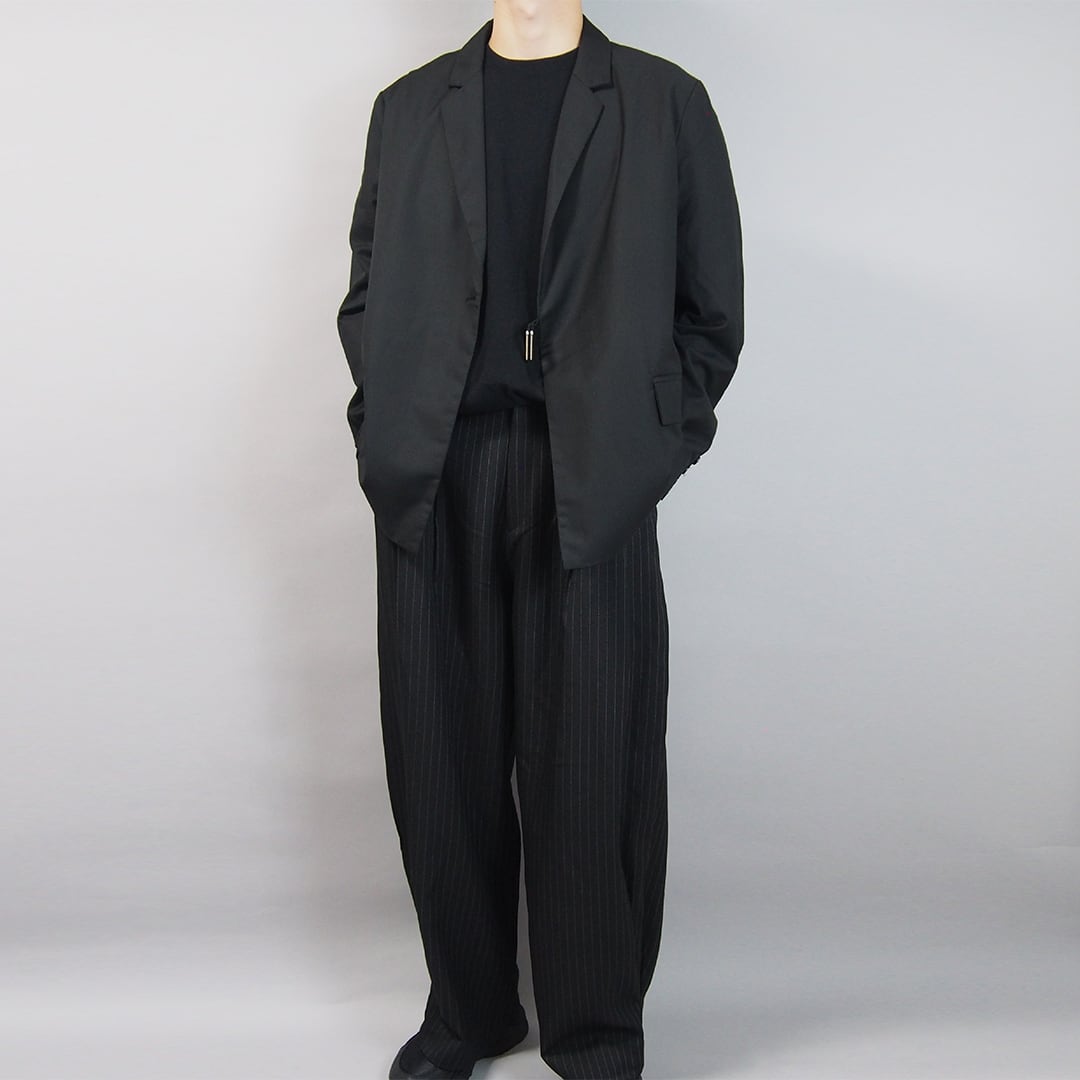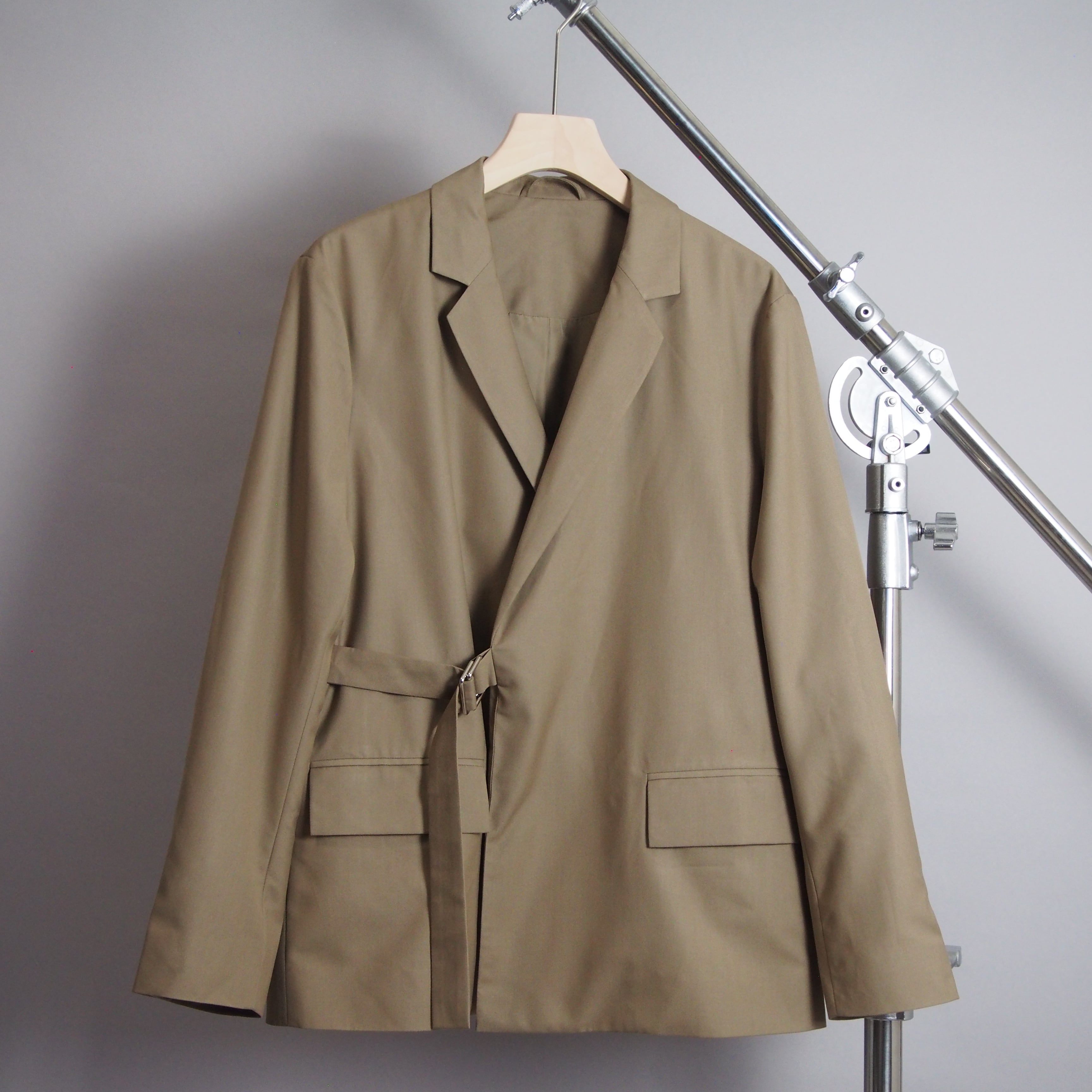 クラシックなテーラードスタイルにフロントを留めるベルトのデザインを合わせることで従来のジャケットにはない新鮮なアクセントをプラス。